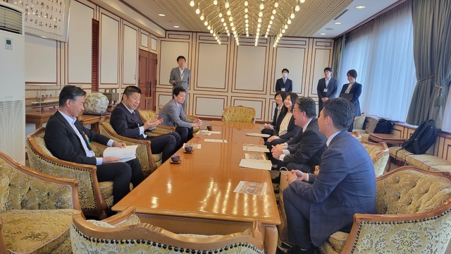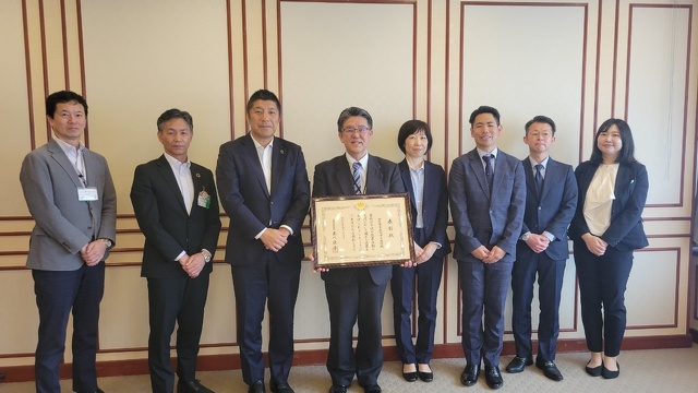 この受賞を受け、四日市市立羽津中学校の中村賢司校長と学校図書館担当の寺本優太先生とともに、四日市市役所を訪問し、森智広市長に受賞報告を行いました。